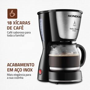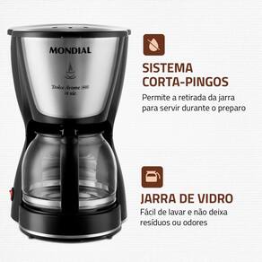 NãoComece seu dia com aroma e sabor! A Cafeteira Elétrica Mondial Dolce Arome C-30-18X tem capacidade para preparar até 18 xícaras de café, Possui filtro permanente e porta-filtro removível, proporcionando sustentabilidade ao meio ambiente. Para conservar a temperatura, conta com jarra de vidro e base com aquecimento. Com design elegante, é ideal para valorizar o seu cantinho. Além disso, conta com sistema corta-pingos, permitindo retirar a jarra para servir o café durante o preparo. Aproveite a qualidade que só a Mondial tem a oferecer!