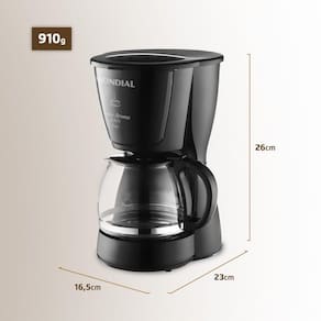A Cafeteira Elétrica Dolce Arome Black prepara até 18 xícaras de café. Com jarra de vidro fácil de lavar, sistema corta-pingos e base com aquecimento para café quente a qualquer hora. Ela ainda indica quantas xícaras serão feitas. Sua JARRA DE VIDRO não fica com resíduos e odores, podendo ser levada à mesa. Com seu SISTEMA CORTA-PINGOS, você pode retirar a jarra para servir o café mesmo durante o preparo. Já a BASE COM AQUECIMENTO conserva a temperatura, para você ter CAFÉ QUENTINHO POR MAIS TEMPO sem alterar o sabor. Já a TAMPA BASCULANTE traz MAIS FACILIDADE na hora de colocar a água e o pó de café. Esta cafeteira tem ainda um INDICADOR DE NÍVEL DE ÁGUA, mostrando QUANTAS XÍCARAS SERÃO FEITAS, para você passar o café na medida certa. A Cafeteira Elétrica Dolce Arome Black foi desenvolvida PARA USO DOMÉSTICO, residencial. Tudo isso com 1 ANO DE GARANTIA MONDIAL. A Mondial é a escolha de milhões de consumidores.