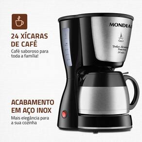 Características do Produto: Marca: Mondial Modelo: Dolce Arome Thermo Referência de modelo: C-33JT Potência: 800 Watts Frequência: 60 Hz Tampa: Basculante Jarra: Térmica em inox Base: Com aquecimento Sistema corta pingos: Sim Botão liga/desliga: Sim Plugue e tomada: 10 A Consumo de energia: 0,8 kW/h Indicador do nível de água: Sim Capacidade de cafés: 24 xícaras Filtro: Permanente, removível e lavável Luz indicadora de funcionamento: Sim