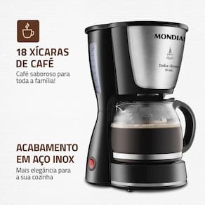 Comece seu dia com aroma e sabor! A Cafeteira Eletrica Mondial Dolce Arome C-30-18X tem capacidade para servir ate 18 xicaras de cafe. Possui filtro permanente e porta filtro removivel que proporcionam mais sustentabilidade ao meio ambiente. Para conservar a temperatura, conta com jarra de vidro e base com aquecimento. Com design elegante e compacto, e ideal para valorizar o seu cantinho do cafe.