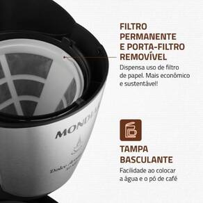 FILTRO PERMANENTE E PORTA-FILTRO REMOVÍVEL: A cafeteira dispensa a utilização do filtro de papel. Além de economizar, você ainda torna o seu dia a dia mais sustentável.
