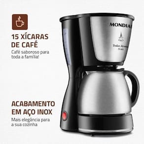 A Cafeteira Elétrica Dolce Arome C-34-JI-15X pode preparar até 15 xícaras de café com muita praticidade. Possui filtro permanente e porta-filtro removível que proporcionam mais sustentabilidade ao meio ambiente. Moderna, a jarra em inox é mais durável, fácil de lavar e pode ser levada à mesa. Conta com sistema corta-pingos e base com aquecimento para conservar a temperatura do café por mais tempo. Saiba mais sobre a C-34-JI-15X da Mondial:
