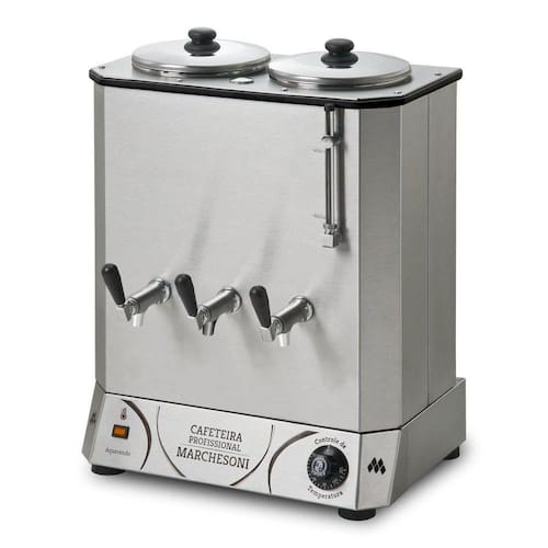 Bojos em aço inoxidável 304 material apropriado para contato com alimentos e bebidas; Resistências blindadas de alta performance; Exclusiva torneira horizontal, indicada para café e leite; Acompanha vareta para limpeza das torneiras; Termostato para controle de temperatura de 20C a 120C; Visor de nível para reservatório de água; Acompanha coador de pano; Ideal para manter a bebida aquecida; Indicadas para bares, padarias, restaurantes, cafeterias, lanchonetes, escolas, faculdades, indústrias e serviços de alimentação em geral.