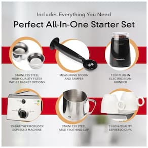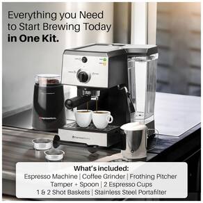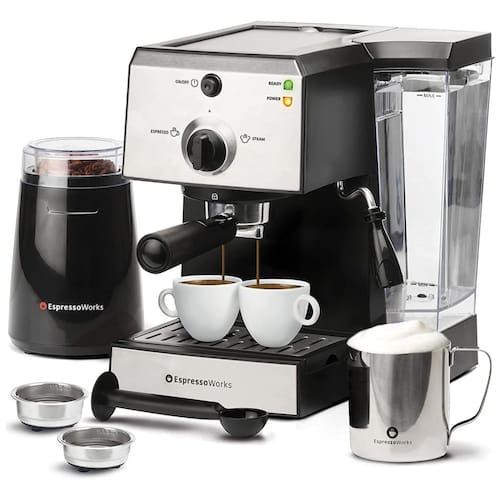 PRONTO PARA USO EM 45 SEGUNDOS Basta adicionar feijão Com o avançado sistema de aquecimento rápido Thermoblock, você sempre pode esperar temperatura precisa e vapor instantâneo do EspressoWorks All In One Set, 1350W ÁGUA REMOVÍVEL TANQUE Monitore convenientemente os níveis de água do tanque transparente de vista frontal capacidade de 1,25 L Alça incluída no tanque para fácil remoção para limpeza e reabastecimento SISTEMA DE PRESSÃO DA BOMBA DE 15 BAR Desfrute de uma excelente degustação de café expresso italiano, americano e Macchiato. copo de espuma incluído para facilitar a preparação de café com leite e capuccino FÁCIL DE LIMPAR Dispositivo de espuma removível e bandeja de gotejamento removível para garantir uma limpeza sem complicações TIRO ÚNICO OU TIRO DUPLO Duas cestas de porta filtro de aço inoxidável incluídas para a opção de puxar uma única tiro ou tiro duplo durante cada extração. A máquina de café Thermoblock EspressoWorks All In One 15 Bar está pronta para uso em menos de 45 segundos. Com seus acabamentos em aço inoxidável, esta poderosa máquina fica ótima em qualquer cozinha e aprimora toda a sua experiência com café expresso, cappuccino e café com leite. A bomba de 15 barras cria o creme perfeito e nunca foi tão fácil obter um sabor arrojado. O conjunto da Multifuncional inclui todos os acessórios para você começar moedor elétrico, porta filtro, copo de espuma de aço inoxidável, colher medidora e adulteração. Não é necessário comprar acessórios adicionais. A máquina é poderosa, mas compacta e fica confortavelmente em qualquer bancada. Com nosso recurso de desligamento automático, a máquina será desligada após 25 minutos de inatividade não é necessário se preocupar em conectar e desconectar sua máquina Máquina de café expresso termobloco de 15 BAR aquece rapidamente e fica pronta para uso em menos de 45 segundos 120 Voltagem, 1350 Watts Fácil de usar, fácil de limpar. Equipado com um tanque de água de vista frontal, o EspressoWorks permite um monitoramento fácil e conveniente dos níveis de água sem precisar mover a máquina e remover e recarregar facilmente usando o alça embutida O conjunto EspressoWorks inclui uma varinha de vapor integrada para aquecer ou aquecer o leite para preparar sua bebida favorita à base de café expresso. O conjunto inclui um copo de espuma de leite em aço inoxidável para sua conveniência Nosso moedor elétrico plug in é fácil de usar e muito poderoso. Equipadas com um tampo de torção manual, as lâminas de aço inoxidável são rápidas, duráveis e fáceis de limpar. Máquina de café expresso e cappuccino all in one de 7 peças com sistema de vaporização e batedor embutidos. Ótimo para iniciantes All In One perfeitos, inclui tudo o que você precisa necessidade. Ótimo para presentear. Amantes de café com leite, cappuccino e café expresso, festas em casa, escritórios e presentes. Pressão da bomba 15 Bar Sistema de pressão da bomba 19 Bar Sistema de pressão da bomba Tempo de preparação do aquecimento 45 60 segundos 45 60 segundos Sistema de aquecimento Sistema de aquecimento avançado de termoblocos Sistema de aquecimento avançado de termoblocos Steamer de leite Espuma manual Varinha de vapor manual Espuma automática com tanque de água removível. Capacidade do tanque de água 1,25L 1.4L Acessórios Moedor de grãos de café, Colher , calcadeira, Portafilter, Cesta de filtro de tiro único, Cesta de filtro de tiro duplo, 2 xícaras de café expresso em cerâmica, Jarra de espuma de leite Moedor de grãos de café, Colher , calcadeira, Porta filtro, Cesta de filtro de tiro único, Cesta de filtro de tiro duplo, 2 xícaras de cappuccino, 2 xícaras de café expresso, modelos de estêncil de arte Dimensões 25cm x 23cm x 30cm. A 21,5cm x 25,4cm x 30,5cm. Recurso de desligamento automático. Potência 1350W 1250W