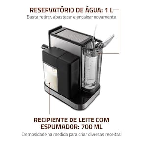 Reservatório de Leite com Espumador Integrado: O tanque de 700ml cria a espuma de leite na textura ideal para suas bebidas. Ele é removível e pode ser guardado na geladeira para manter o leite fresco.