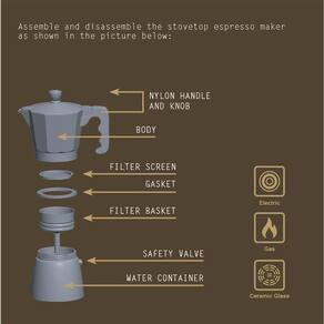 Cafeteira italiana em alumínio, 320ml de capacidade, cabo em nylon, preta.Moedor de café integrado