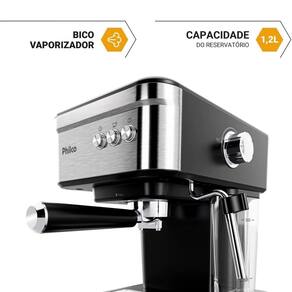 -Marca: Philco -Capacidade: 1,2 Litros -Potência: 950W -Dimensões do Produto: 27,3 cm (Profundidade) x 22 cm (Largura) x 28,4 cm (Altura) -Peso: 1,8 kg -Características Especiais: Aquecedor de copo, tanque removível