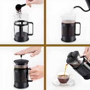 1. Adicione o café à cafeteira. Use 10 gramas de café moído para cada 180 ml de água. 2. Ferva a água e logo depois coloque na cafeteira. 3. Utilizando uma colher, mexa o café por 3-5 minutos. Este processo permitirá uma máxima extração do café. 4. Aguarde 30 segundos e então empurre o êmbolo até o fim mantendo a pressão firme e lenta. 5. Sirva seu Café!!