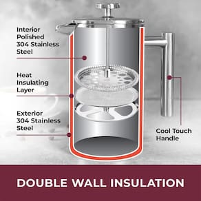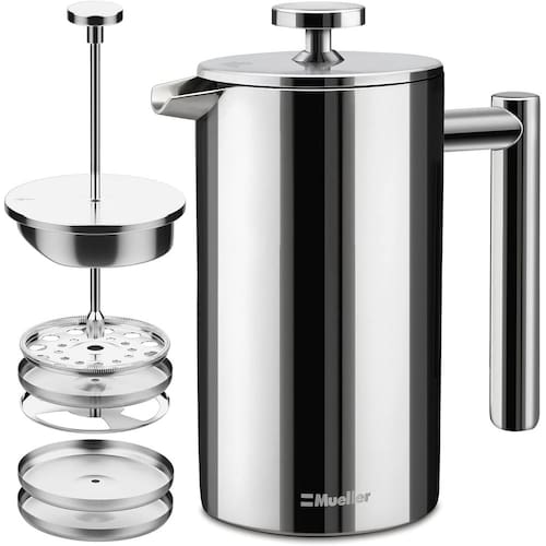 - Leve para qualquer lugar — Nossa prensa francesa de aço inoxidável sem ferrugem é durável para uso em acampamentos, no escritório ou fazendo café em casa. A garrafa de parede dupla desta prensa francesa MuellerLiving mantém seu café quente e cheio de sabor.