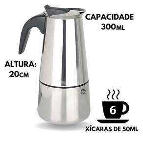 Ficha Técnica: Tipo: Cafeteira italiana/moka Material: Aço inoxidável Capacidade: 300ml (6 xícaras) Prata Espessura: 0,6mm Dimensões: 18,5cm x 9,5cm Peso: 417g Compatibilidade: Gás, elétrico, indução Alça: Resistente ao calor Válvula de segurança: Sim Filtro: Permanente em inox Acabamento: Polido