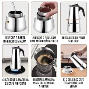 Características do Produto Capacidade para 6 xícaras (300ml) Corpo em aço inoxidável Espessura de 0,6mm Compatível com fogão a gás, elétrico e indução Válvula de segurança integrada Alça resistente ao calor Filtro permanente em inox Fácil desmontagem para limpeza Acabamento polido Peso aproximado de 417g