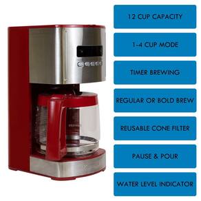 Cafeteira Kenmore com 12 xícaras, filtro reutilizável, temporizador programável, visor digital, garrafa de vidro com controle de aroma, filtro de água, carvão, regular, aço inoxidável e vermelho