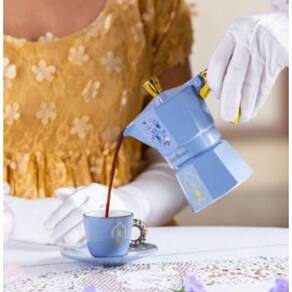 O formato icônico que remonta a 1933 é combinado com padrões florais e decorações douradas para tornar a pausa para o café ainda mais preciosa e romântica.