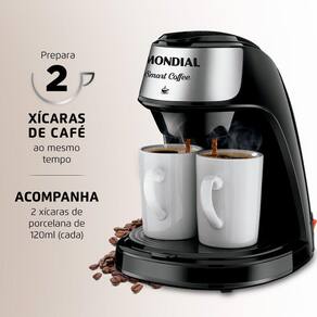 A Cafeteira 2 Xícaras Smart Coffee C-42-2X-BI foi desenvolvida para passar dois cafés, ao mesmo tempo, na medida certa e direto na xícara. Possui filtro permanente com porta-filtro removível que dispensa o uso do filtro de papel, tampa basculante e bandeja removível antiderrapante, além de design moderno com acabamento em aço inox. Acompanha 2 xícaras de porcelana e 1 colher dosadora. Saiba mais sobre a C-42-2X-BI da Mondial: