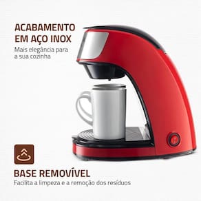 DESIGN MODERNO: Na cor vermelha e acabamento em inox, a cafeteira proporciona mais elegância à sua cozinha.