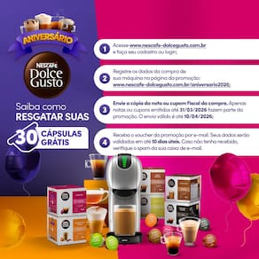 Tecnologia e sofisticação a um toque de distância. A cafeteira NESCAFÉ® Dolce Gusto Genio S Touch oferece um painel touch intuitivo, Espresso Boost, 4 níveis de temperatura e Função XL. Com 15 bar de pressão e modo Eco, ela proporciona controle total para preparar cafés e bebidas personalizadas com qualidade de barista. Experimente o Sistema NESCAFÉ® Dolce Gusto. Esta máquina multibebidas prepara cafés, cappuccinos, chocolates e chás com a praticidade das bebidas em cápsulas. Ideal para quem deseja conveniência, design premium e sabor de cafeteria em casa. Descubra a excelência da máquina de café Genio S Touch. Eleve sua experiência de café com uma cafeteira que combina inovação, estilo sofisticado e uma experiência de bebida incomparável. Aproveite a conveniência e a qualidade de cafeteria no conforto do seu lar.