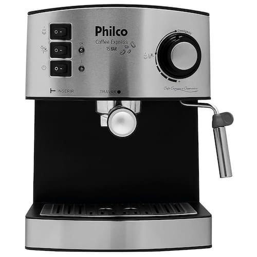 Cafeteira Expresso Philco Coffee Express com pressão de 15Bar, prepara Café Expresso e Cappuccino, filtro permanente em aço com duas saídas, reservatório de água com capacidade 1600ml, bico vaporizador, acompanha colher dosadora e possui depósito de resíduos removível.Moedor de café integrado