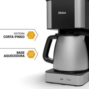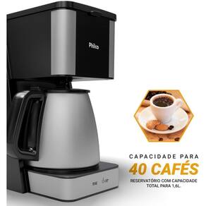 Marca: Philco Modelo:53901081 Voltagem: 127V/220V Potência (w): 950 Consumo (kW/h): 0,95 Cor: Preto Capacidade (cafezinhos): 40 Sistema cortapingo: Sim Função Timer: Não Display Digital: Não Placa de aquecimento: Sim Capacidade do reservatório de água (l): 1,6 Acompanha colher dosadora: Sim Filtro permanente: Sim Jarra pode ser levada à mesa: Sim Dimensões (L x A x C): 20 x 25 x 35 cm Peso: 1,95 kg