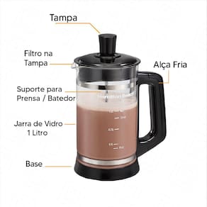 Esta cafeteira é ideal para preparar não apenas café, mas também chás e chocolate quente. Ela inclui um acessório para espumar as misturas de chocolate, sejam quentes ou frias.