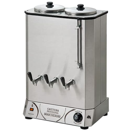 A Linha Profissional Marchesoni é fabricada com dois bojos, possibilitando servir dois tipos de bebidas simultaneamente, além de manter a temperatura e servir com praticidade. As cafeteiras da linha Profissional Marchesoni foram desenvolvidas para atender com segurança as maiores demandas no serviço de alimentação. Bojos em aço inoxidável 304 - material apropriado para contato com alimentos e bebidas; Resistências blindadas de alta performance; Exclusiva torneira horizontal, indicada para café e leite; Acompanha vareta para limpeza das torneiras; Termostato para controle de temperatura de 20ºC a 120ºC; Visor de nível para reservatório de água; Acompanha coador de pano; Ideal para manter a bebida aquecida; Indicadas para bares, padarias, restaurantes, cafeterias, lanchonetes, escolas, faculdades, indústrias e serviços de alimentação em geral. Modelo: CF.4.821/822 Capacidade: 16 litros 2 bojos de 8 litros cada ; Consumo: 2500W / 2,50kw/h; Alimentação: 127v ou 220v; Dimensões do Produto CxAxL : 42 x 75 x 36 cm; Dimensões da Embalagem CxAxL : 45 x 76 x 41 cm; Peso líquido: 15,2 kg; Peso bruto: 17,6 kg.