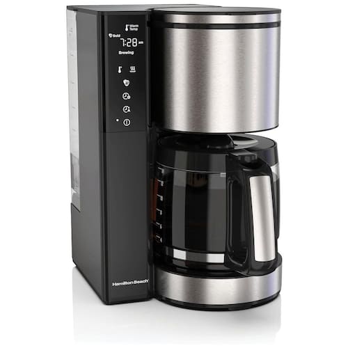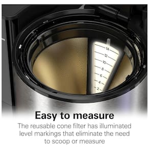 A cafeteira Hamilton Beach Easy Measure é uma excelente opção para quem busca praticidade na hora de preparar o café. Com capacidade para 14 xícaras, ela possui um filtro cônico reutilizável com marcações de nível iluminadas que eliminam a necessidade de colher ou medir o café, tornando o processo mais fácil e preciso. Além disso, o reservatório de água removível de 2L possui marcações fáceis de ler, permitindo que você saiba exatamente quanta água adicionou ou se precisa ser reabastecido. A cafeteira também conta com uma tela sensível ao toque ativada por toque, que torna o processo de seleção das configurações ainda mais fácil e intuitivo. O recurso de preparo com atraso programável de 24 horas permite que você configure o café com antecedência, para que esteja pronto quando você precisar. E o conveniente recurso Auto Pause Pour permite que você tome uma xícara sem esperar que toda a panela esteja pronta. Com a Hamilton Beach Easy Measure, preparar o seu café nunca foi tão fácil e prático.