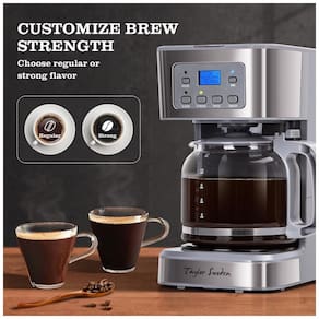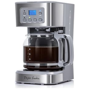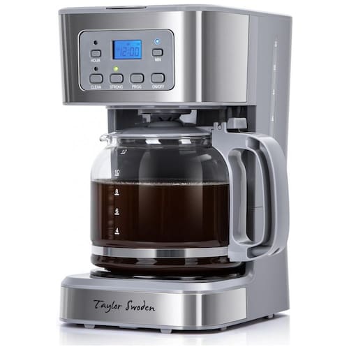 A Cafeteira Programável Taylor Swoden permite preparar até 12 xícaras de café com controle total via cronômetro programável de até 24 horas através de display LCD, para garantir café quente na hora desejada. Apresenta sistema anti-gotejamento que possibilita pausar o preparo para servir sem bagunça. O equipamento possibilita ajuste da intensidade do café entre regular e forte, graças ao design exclusivo do chuveiro que distribui uniformemente a água sobre o pó, otimizando a extração do sabor. O filtro permanente suporta uso com diferentes tipos de café moído e chá.