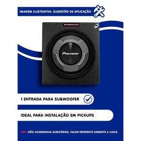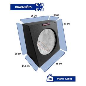 CARACTERÍSTICAS - Dimensões compactas, ideal para instalar em caçambas de pick-ups ou espaços laterais - apertados do veículo; - Volume acústico eficiente: estrutura selada com 11 litros internos, proporcionando controle de pressão e graves mais definidos; - Acabamento resistente: MDF de 15–18 mm com revestimento de courvin perfurado preto e manta isolante acrílica, assegurando isolamento acústico e durabilidade; - Fixação e montagem segura: plugs parafusados com fio e cola branca com serragem garantem encaixe firme e resistente à vibração.