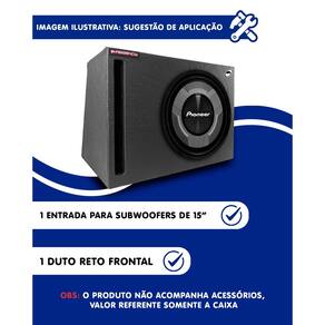 CARACTERÍSTICAS - Capacidade: acomoda 1 subwoofer de 15", ideal para sistemas de som automotivo potentes; - Volume interno eficiente: estrutura com 70 L, proporcionando controle de pressão e graves mais definidos; - Construção resistente: fabricada em MDF de 15–18 mm, revestida com courvin perfurado preto e manta isolante interna; - Design funcional: duto reto frontal que favorece a eficiência acústica e facilita a adaptação em diversos espaços do veículo.
