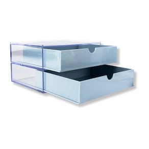 A caixa organizadora multiuso com duas gavetas, fabricada com materiais resistentes, é composta por uma estrutura acrílica transparente que proporciona durabilidade e um aspecto sofisticado, permitindo a fácil visualização dos itens armazenados. Com duas gavetas deslizantes, ela oferece versatilidade para guardar objetos de diferentes tamanhos e categorias, elas poussuem recortes semicirculares na frente para facilitar a abertura sem a necessidade de puxadores adicionais. Seu design é moderno e minimalista, combinando praticidade e elegância para diversos ambientes, como escritórios, penteadeiras, banheiros e escrivaninhas.