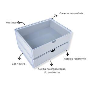 A caixa organizadora multiuso com duas gavetas, fabricada com materiais resistentes, é composta por uma estrutura acrílica transparente que proporciona durabilidade e um aspecto sofisticado, permitindo a fácil visualização dos itens armazenados. Com duas gavetas deslizantes, ela oferece versatilidade para guardar objetos de diferentes tamanhos e categorias, elas poussuem recortes semicirculares na frente para facilitar a abertura sem a necessidade de puxadores adicionais.