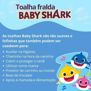 Contém 1 Caixa 3 Toalha Fralda de Pano Bebe Baby Shark Tamanho 70X120CM Marca Cremer Tecido duplo 100% algodão Contém acabamento em bainha nos 4 lados Estampa unissex As fraldas 100% Algodão proporcionam maciez e conforto para a pele delicada do bebê, já vem com a bainha feita e pode ser Utilizado como: - Auxilio na Higiene do Bebê - Cheirinho na hora da Naninha - Utilizar como manta, - Protetor de Carrinho ou moisés, - Base de Trocador, - Apoio a mamada e alimentação. Marca: Não Informado Ean: 7891494368270