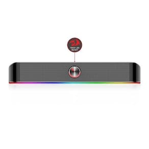 - Design elegante e minimalista que se adapta a qualquer ambiente. - Iluminação RGB na base da unidade para trazer mais brilho ao setup do usuário: - Roda de volume na parte frontal da unidade para ajustes rápidos de volume - Botão touch capacitivo na parte superior para mais praticidade.