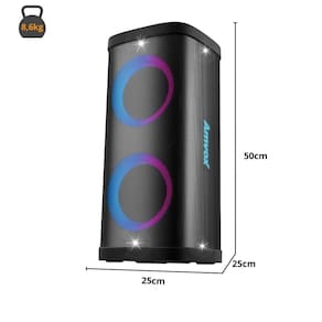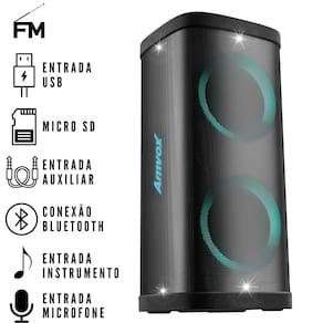 Caracteristicas: -Potencia: 1200W -Woofer: 2 Woofer de 6,5 cm -Bluetooth versão 2.1 -2 Entradas para Microfone -Função Prioridade Microfone -Radio FM -Luzes de LED -Função POWER -Graves Profundos