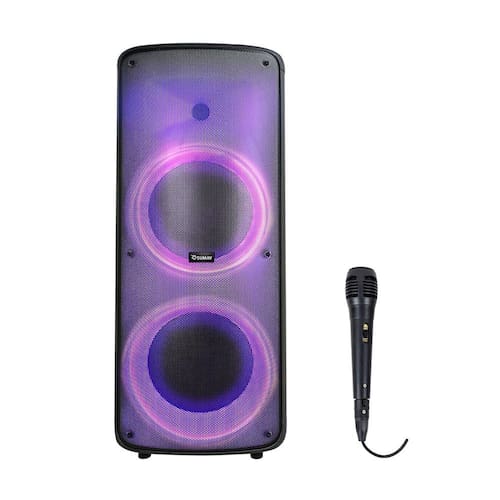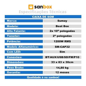 Especificações -Marca: Sumay -Modelo: Beat Box -Modelo Alfanumérico: SM-CAP32 -Cor: Preto -Design: Portátil -Sistema de Iluminação: LED -Potência: 1200W RMS -Alto-Falante: Subwoofer 2x 10” polegadas -Tweeter: 2” polegadas -Frequência de Resposta: 60 ~ 18KHz -Impedância: 4 Ohms -Função Bluetooth: Sim -Função TWS: Sim -Função Microfone Prioridade: Sim -Função Gravar (Rec.): Sim -Troca de Pastas: Sim -Controle de Echo: Sim -Controle de Graves e Agudos: Sim -Fonte de Alimentação: 110-220V ~50/60Hz -Bateria Recarregável: Sim -Autonomia da Bateria: 2 horas (80% do volume) -Rádio: FM -Controle Remoto: Sim -Conexões (Entradas): BT/ TWS / USB / AUX /SD / FM / 2x P10 -Entrada AUX: P2 -Material: Caixa em ABS -Dimensões (L x A x C): 33 x 83 x 30cm -Peso: 12,30 Kg -Peso Bruto: 14,80