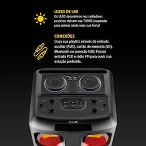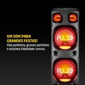 A caixa de som Torre Double Pulse com 2.200 W de potência, 2 alto-falantes, subwoofers duplos e LEDs decorativos garante um som potente e muita diversão.