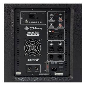 Caixa som sub 12 pol + 2 torre satélite 1100w mp3 bluetooth cor preto. O l2-1284 da marca waldman é um sistema de áudio da linha line up duo composto por um subwoofer amplificado e dois satélites passivos com 4 alto-falantes cada, que foi desenvolvido para oferecer áudio de qualidade e alta potência para festas e eventos. Com o l2-1284 você poderá reproduzir suas músicas favoritas com alta qualidade sonora. O subwoofer é ativo amplificado e conta com um alto-falante woofer de 12 polegadas com 600w de potência rms. As 2 torres são passivas e contam com 4 alto-falantes de 4 polegadas cada, entregando 500w rms 250w+250w . No total, o sistema com sub + 2 satélites conta com uma potência de 1100w rms. O subwoofer ativo conta com mp3 player acompanhado de display lcd, porta usb e sd card, e ainda oferece conexão via bluetooth que facilita a seleção das músicas diretamente de dispositivos móveis. Conta também com duas entradas combo xlr+p10 para microfone, entrada rca l/r e entrada auxiliar p2, além de duas entradas de linha xlr fêmea, duas saídas mix out xlr macho e 2 saídas speakon de 2 pólos para alimentar as caixas passivas do sistema. Além disso, o sub possui controles de volume, ajuste de frequência, botão de inversão de fase phase 0 ou 180, botão stereo/mono, controle de nível echo, botão liga/desliga, tensão bivolt com chave seletora, fusível de proteção e indicadores de led power e limit. Com corpo robusto em madeira e tela metálica resistente de proteção frontal para maior durabilidade, o sistema de áudio l2-1284 da waldman é o kit ideal para shows, bares, igrejas, auditórios e eventos em geral. Especificações técnicas: - marca: waldman - modelo: l2-1284 - linha: line up duo - tipo: kit com subwoofer ativo + 2 satélites/torres com caixas passivas - potência rms do sistema: 1100w - potência musical: 2200w - potência de pico: 4400w - tela metálica de proteção frontal - ideal para: shows, auditórios, bares, igrejas e eventos em geral - acompanha: 02 tripés, cabos de áudio e de energia Sub woofer ativo: - alto falante: woofer de 12 polegadas - amplificador classe d - material: mdf 15mm - potência rms: 600w - conectividade: bluetooth - mp3 player com display - porta usb e sd card - controle de volume: subwoofer, master, mp3/auxiliar, microfone - ajuste de frequência/crossover do sub: 40 hz - 160 hz - range de frequência: 43-800 hz - botão de inversão de fase phase 0 ou 180 - indicador de led limit e power - 2 entradas combo xlr+p10 para microfone - 2 entradas de linha xlr fêmea l/r - entrada auxiliar: rca l/r , p2 - 2 saídas de áudio xlr macho l/r - 2 saídas speakon para passivas satélites - sistema de ventilação - botão liga/desliga - fusível - chave seletora de tensão - tensão: bivolt 115/230v - 50/60hz Satélites: - tipo: caixas passivas - material: plástico de alta densidade - composto por 02 tripés - 2 torres com 4 alto-falantes de 4 polegadas em cada - driver 1 polegada - potência rms: 500w 250w+250w - range de frequência: 100 hz - 20 khz - conectores de entrada: speakon - : 12 meses - prazo de validade do sitema de áudio: indeterminado