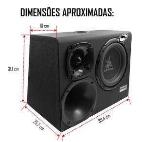 ESPECIFICAÇÕES TÉCNICAS: - Potência de RMS total: 300 Watts; - Resposta de frequência senoidal trio THD 0.01% : De 20 Hz a 20 KHz -3dB ; - Resposta de frequência senoidal SUB THD 0.01% : De 20 Hz a 100Hz -3dB ; - Alto falante 8 bobina simples: 200 Watts; - Drive: 100 Watts; - Tweeter: 100 Watts; - Amplificador digital: 300 Watts; - Caixa: Madeira MDF; - Distorção máxima de saída THD : 01%; - Proteção de temperatura: 80 C; - Consumo máximo: 20A; - Tensão de operação Voltagem de entrada de funcionamento : 10Vcc A 15Vcc; - Tensão de proteção Voltagem de entrada limite : 8.0vcc A 16Vcc; - Sensibilidade de entrada RCA sinal de áudio necessário para obter potência máxima : 0.5vrms A 5Vrms; - Garantia: 1 ano contra defeitos de fábrica.