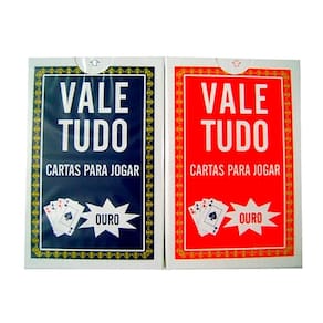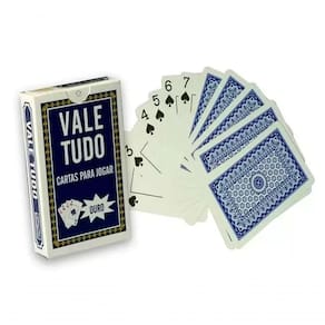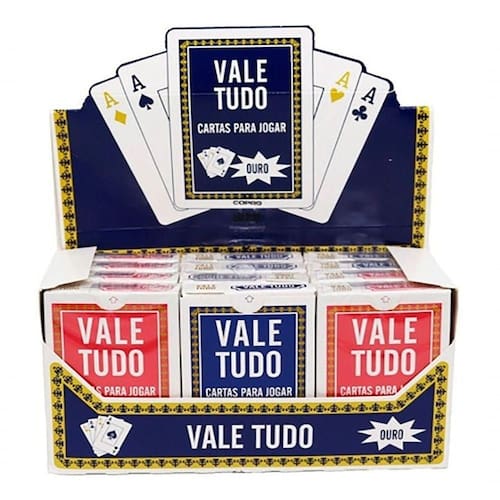 Caixa Baralho Vale Tudo Ouro com um total de 12 baralhos, cada um com 54 cartas. Perfeito para se fazer qualquer tipo de mágica e jogos.
