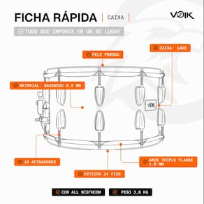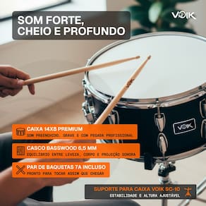 O Kit Caixa de Bateria Voik 14x8 CB14 com Suporte e Baqueta é a escolha ideal para quem busca potência, estabilidade e praticidade. Com casco em madeira Basswood e 8” de profundidade, oferece um som encorpado, com graves marcantes e presença impressionante. O suporte robusto garante firmeza e conforto durante o uso, enquanto a esteira de 24 fios proporciona resposta sensível e definida. Acompanha baqueta Voik de Maple, leve e equilibrada, ideal para tocar com precisão e menos fadiga. Um kit completo, pronto para o palco, ensaio ou estúdio.