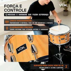 O Kit Caixa de Bateria Voik 14x8 CB14 com Suporte e Baqueta é a escolha ideal para quem busca potência, estabilidade e praticidade. Com casco em madeira Basswood e 8” de profundidade, oferece um som encorpado, com graves marcantes e presença impressionante. O suporte robusto garante firmeza e conforto durante o uso, enquanto a esteira de 24 fios proporciona resposta sensível e definida. Acompanha baqueta Voik de Maple, leve e equilibrada, ideal para tocar com precisão e menos fadiga. Um kit completo, pronto para o palco, ensaio ou estúdio. ? Especificações: Caixa: • Marca: Voik • Modelo: CB14 • Cor: Wood Tone • Pele: Porosa • Casco: Basswood 6,5 mm de espessura • Materiais: Madeira, Metal e PVC • Afinadores: 10 • Aros: Triple Flange 1.6mm • Canoa individual • Esteira: 24 fios • Pele Resposta: Transparente • Timbre: Grave para médio • Circunferência: 14 polegadas • Altura: 8 Polegadas • Peso: 3,868 kg