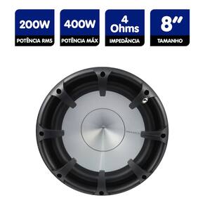 ESPECIFICAÇÕES TÉCNICAS DO SUBWOOFER HURRICANE CLASS 8": - Potencia maxima: 400 W - Potencia de entrada nominal RMS: 200 W - Resposta em frequencia: 356Hz ~ 1.2KHz - Sensibilidade: 87dB - Impedancia: 4 ohms - Cone: PP injetado - Borda: Borracha - Carcaça: Aço - Bobina: Aluminio 1" - Calota: PP