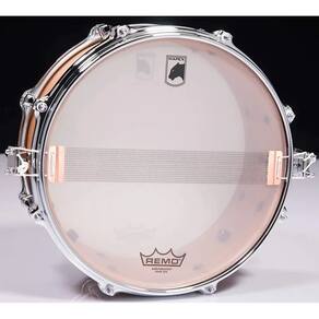 Caixa Black Panther Cherry Bomb 13? x 5.5?, casco de 5.1mm em Cherry Wood (cerejeira), acabamento laqueado, 8 afinações, aros SonicSaver™ 2.3mm, esteira premium 16 fios, ferragens cromadas, peles Remo® AmbassadorCoated™.
