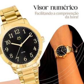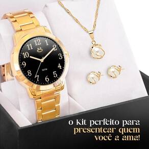 Caixa + Brincos + Relogio Feminino Dourado Aço Inox + Colar Moda Social Strass Presente Casual Kit Completo Orizom Maria Relógio Feminino Analógico Orizom Maria: Apresenta um design deslumbrante dourado, banhado em ouro, e todo confeccionado em aço inoxidável de alta qualidade. Seu visor preto confere um toque de mistério e sofisticação. Um acessório premium que complementará qualquer look com glamour e estilo.