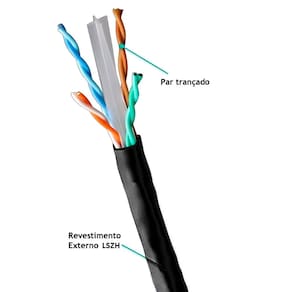 Construção e DurabilidadeOs 4 pares trançados (azul/azul claro, branco/laranja, verde/verde claro, marrom/marrom claro) são reunidos em um núcleo com passo otimizado para reduzir crosstalk e interferências. A capa em PVC antichamas CM INT (70°C) é resistente a chamas e adequada para instalações em tubulações metálicas sem fluxo de ar forçado, conforme normas de inflamabilidade. O cabo suporta temperaturas de -20°C a 60°C e umidade de até 95% sem condensação, garantindo durabilidade em diversos ambientes internos. A marcação métrica decrescente facilita o cálculo de lances e o manuseio, enquanto a embalagem em caixa desenrolável simplifica a instalação.