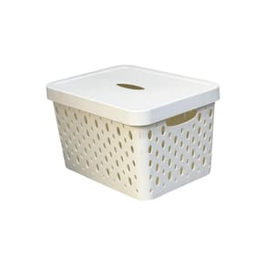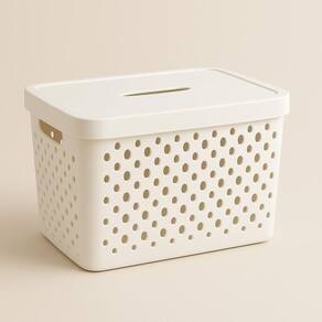 Caixa Cesto Organizador Multiuso Empilhável 17 L Cor Branco DESIGN FUNCIONAL Contorno rebaixado para encaixar o fundo da caixa: Você não precisa deixar a tampa separada ou distante do Cesto, pois o rebaixamento permite que tudo se encaixe perfeitamente, garantindo um acabamento mais ajustado e prático