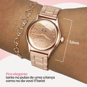 - Relógio Analógico: cor dourada, em aço inoxidável, com tampa personalizada com arte de coração, garantindo um toque único ao seu look.