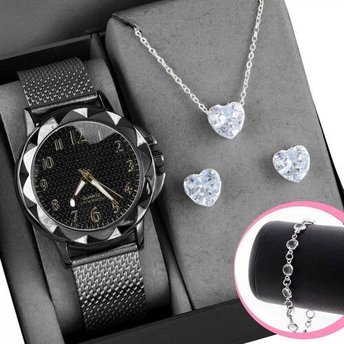 Caixa + Colar Brinco + Relogio Feminino Prova Dagua Aço Inox Kit Elegante de Acessórios em Aço Inoxidável Adicione um toque de luxo e durabilidade ao seu visual com este conjunto sofisticado de acessórios em aço inoxidável. Perfeito para presentear a si mesmo ou alguém especial.