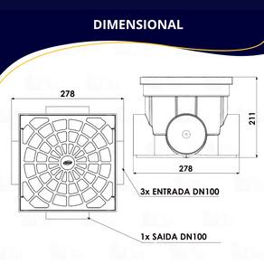 Especificações Técnicas - Matéria-prima: Plástico - Modelo: Coletadora de Água Pluvial - Pressão máxima: Sem pressão (passagem livre) - Capacidade: 7 litros - Dimensões: • Largura: 27,8 cm (tampa) • Altura: 21,1 cm - Entradas e Saídas: • 3 entradas DN 100 / 100 mm • 1 saída DN 100 / 100 mm com declive