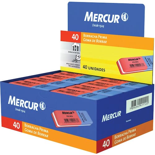 Características: mesmo sendo colorida, não mancha o papel. parte vermelha: é indicada para apagar escrita a lápis e lapiseira. parte azul: é indicada para remoção de tinta de caneta e lápis de cor. É uma borracha mais abrasiva, que possui cris ais pontiagudos em sua composição, o que faz com que seja possível desgastar lixar a folha até a remoção parcial ou total da tinta, ou seja, a borracha não apaga a tinta do papel, mas desgasta a ponto de conseguir removê-la. seu formato chanfrado com quinas auxilia na precisão ao apagar. Ean: 7896342411122