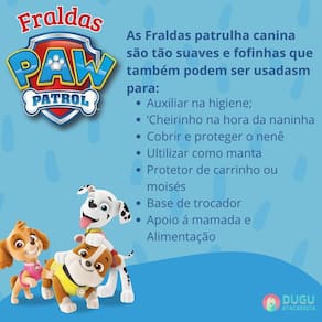Contém 1 caixa Caixa contendo 5 Fralda luxo estampada Patrulha Canina Cremer Tamanho 70x70cm Tecido duplo 100% algodão 52 Fios/cm2 Resiste a 100 lavagens; Alta Absorção Com bainha feita nos 4 lados A linha luxo é a de maior qualidade da Cremer e a mais desejada pelas mães. A fralda mais vendida de toda a categoria não pode faltar no enxoval do bebê. Pode ser Utilizado como cheirinho na hora da naninha; proteção contra o vento e o sol; protetor de carrinho; base de trocador etc. As embalagens em caixa são ótimas para presentear Marca: Não Informado